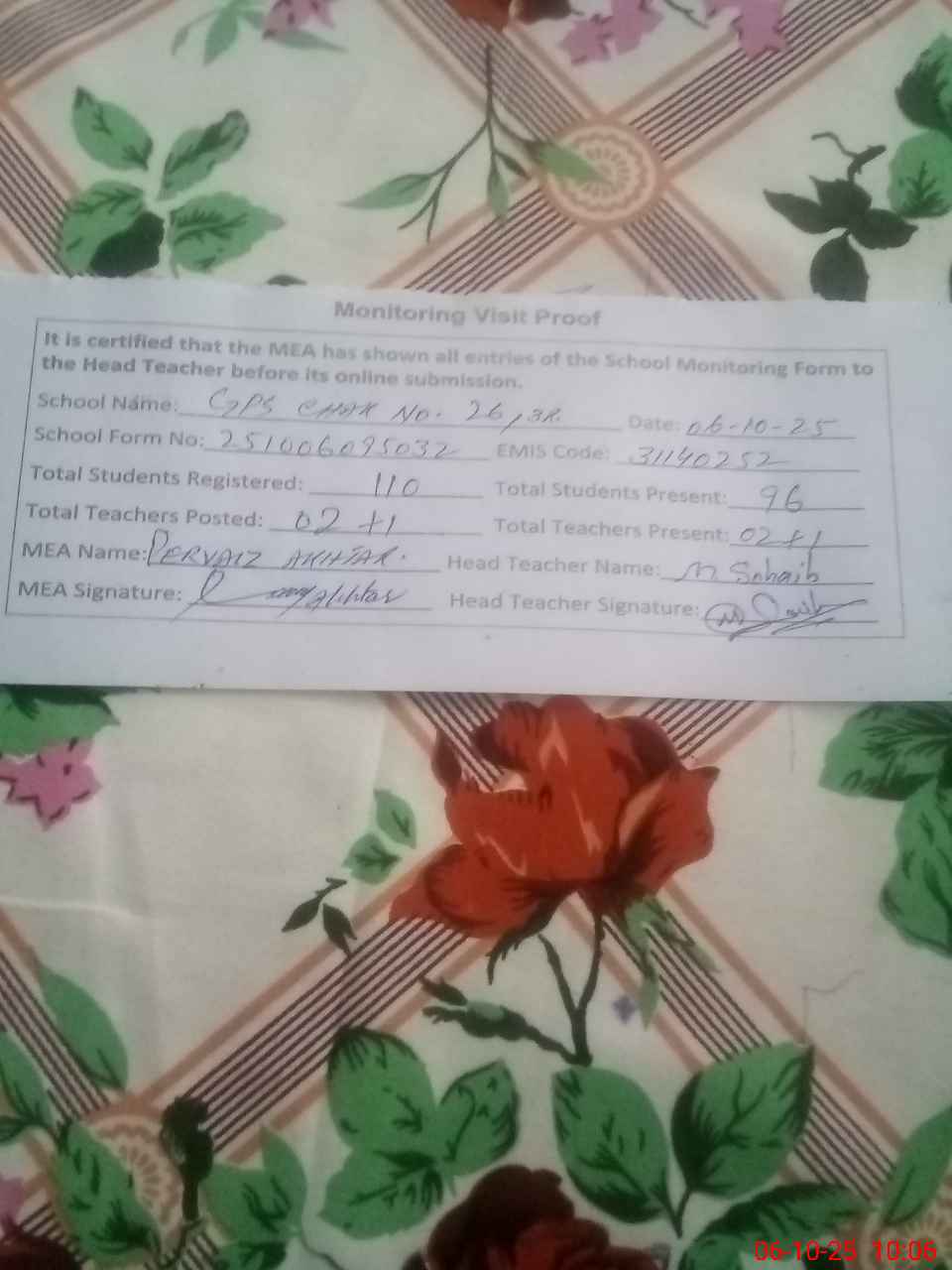 | EMIS Code: 31140252 | Name of School: GPS CHAK NO 26/3-R W | |||