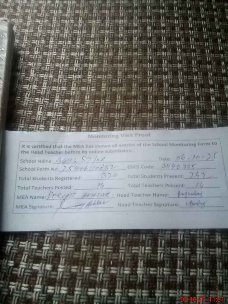 | Certified that this School was Inspected by the Undersigned MEA/DMO Today and the Information Stated Above is as Per Record. | |||||