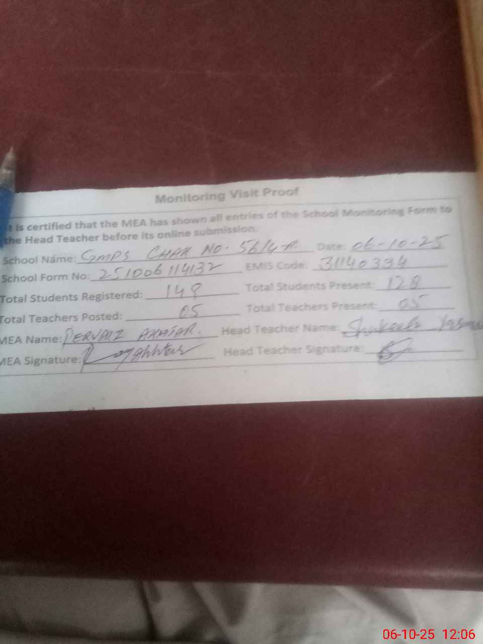 | Attendance Register | Head Teacher | MEA with School | Visit Proof |