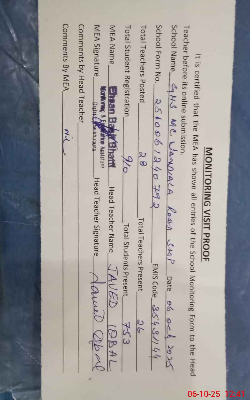 | EMIS Code: 35431144 | Name of School: GHS MC JANDIALA ROAD SHEHR | |||