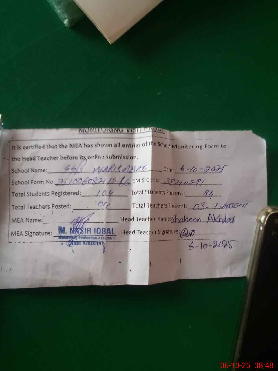 | Monitoring Date: 06-10-2025 | Start Time: 06-10-2025 08:20 AM | End Time: 06-10-2025 08:51 AM | Name of MEA: MU**** NA**** IQ**** | |