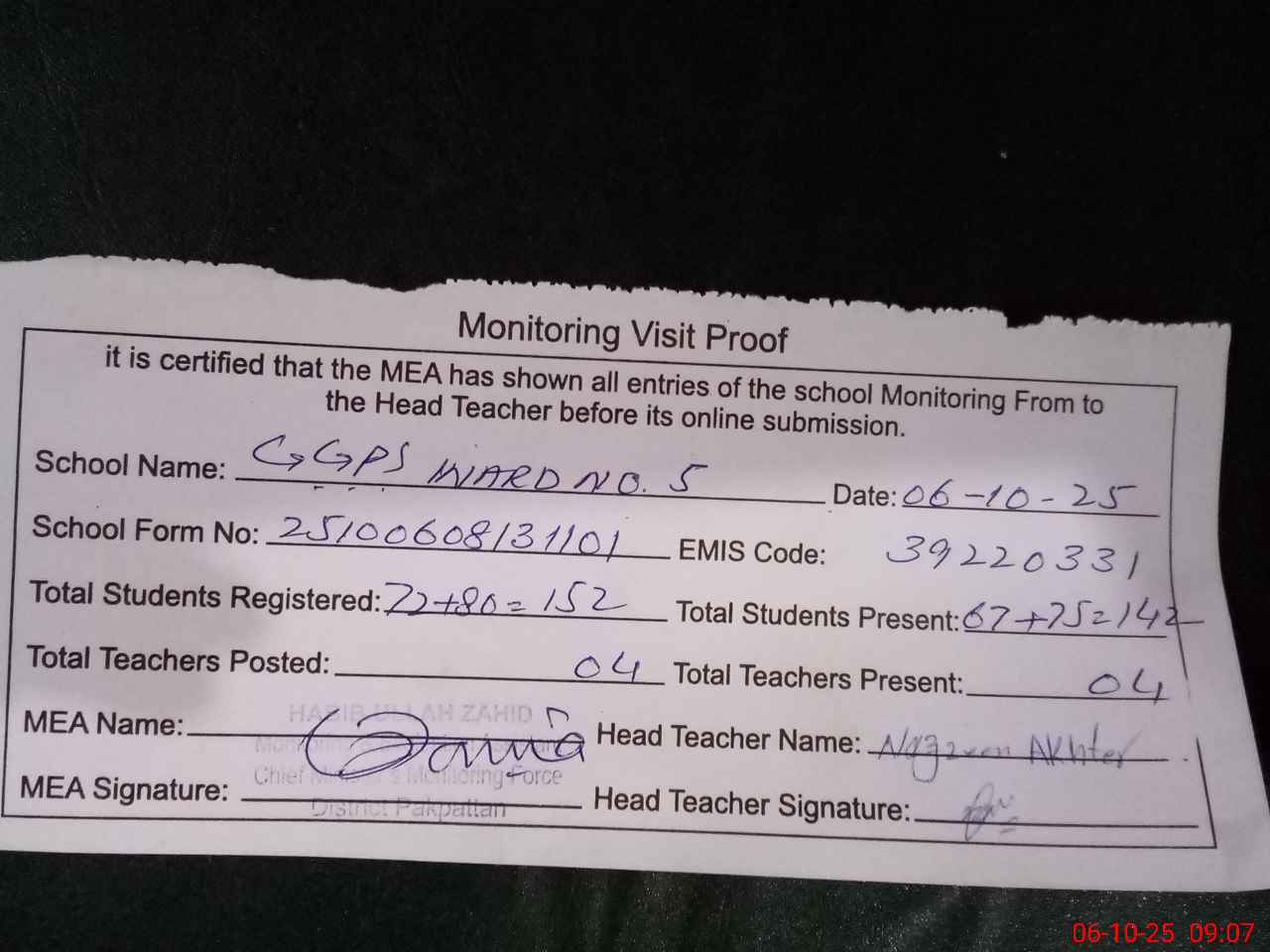 | Monitoring Date: 06-10-2025 | Start Time: 06-10-2025 08:13 AM | End Time: 06-10-2025 09:08 AM | Name of MEA: Ha**** Ul**** Ur**** Ba**** Al**** | |