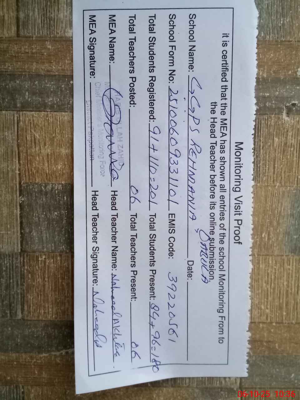 | Certified that this School was Inspected by the Undersigned MEA/DMO Today and the Information Stated Above is as Per Record. | |||||