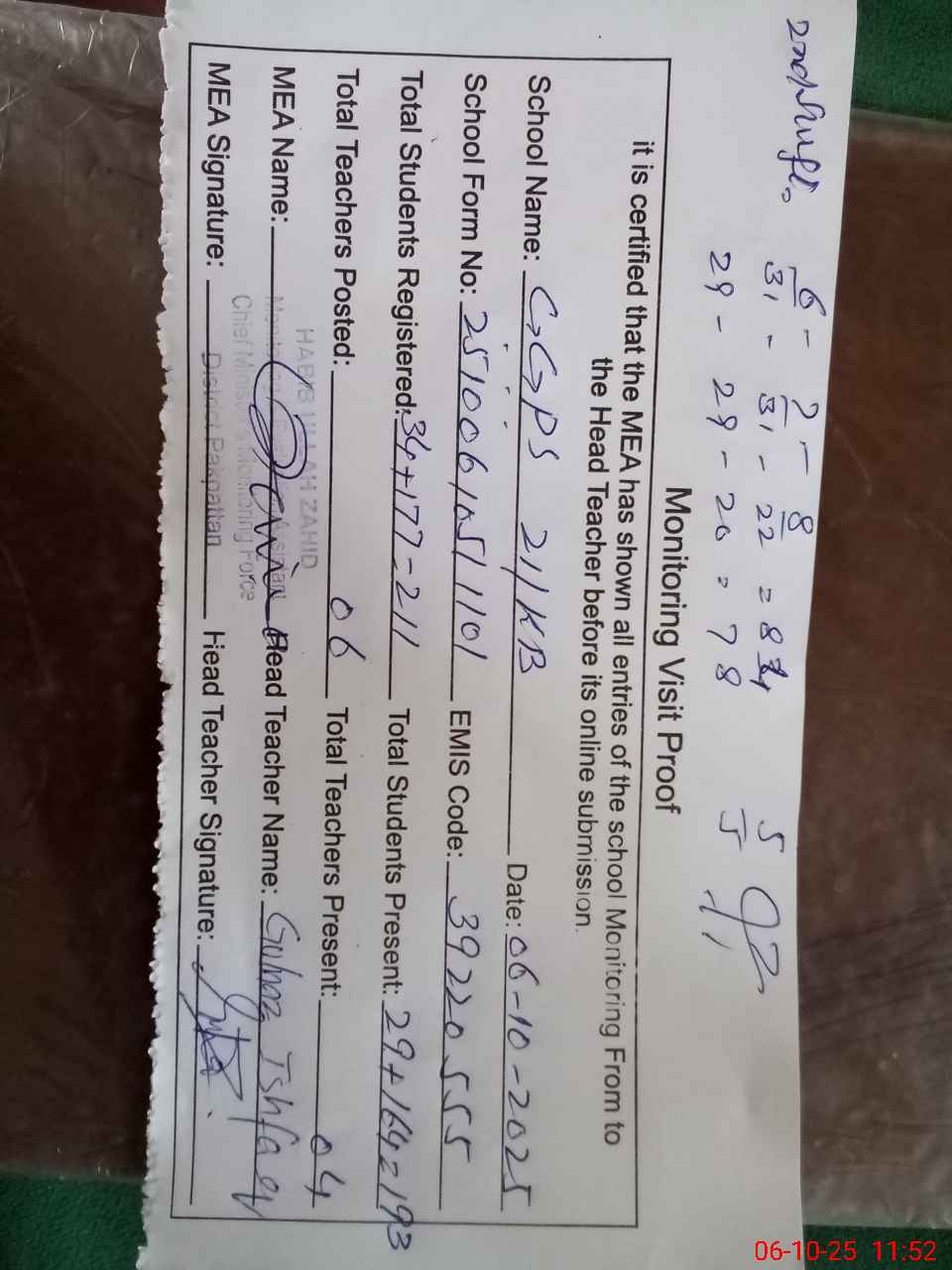 | Attendance Register | Head Teacher | MEA with School | Visit Proof |