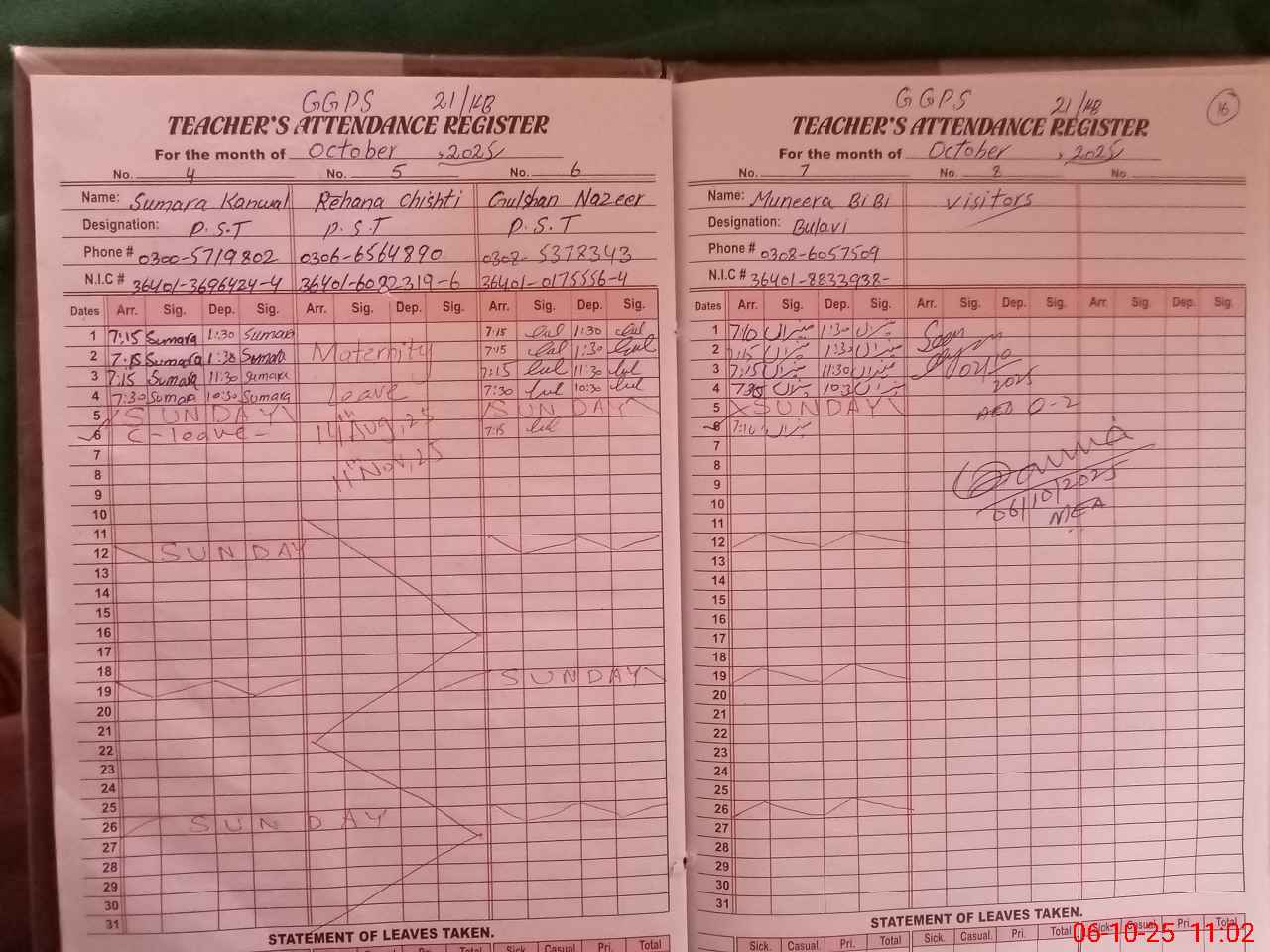 | CNIC | Full Name | Designation | R/C | Absence during last cal. month |