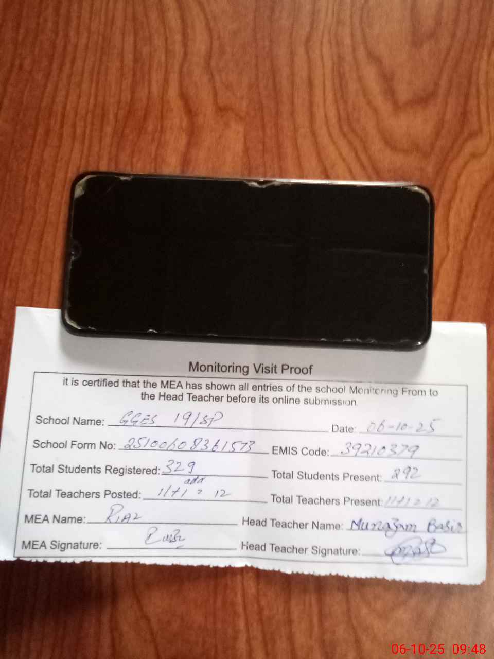 | Attendance Register | Head Teacher | MEA with School | Visit Proof |
