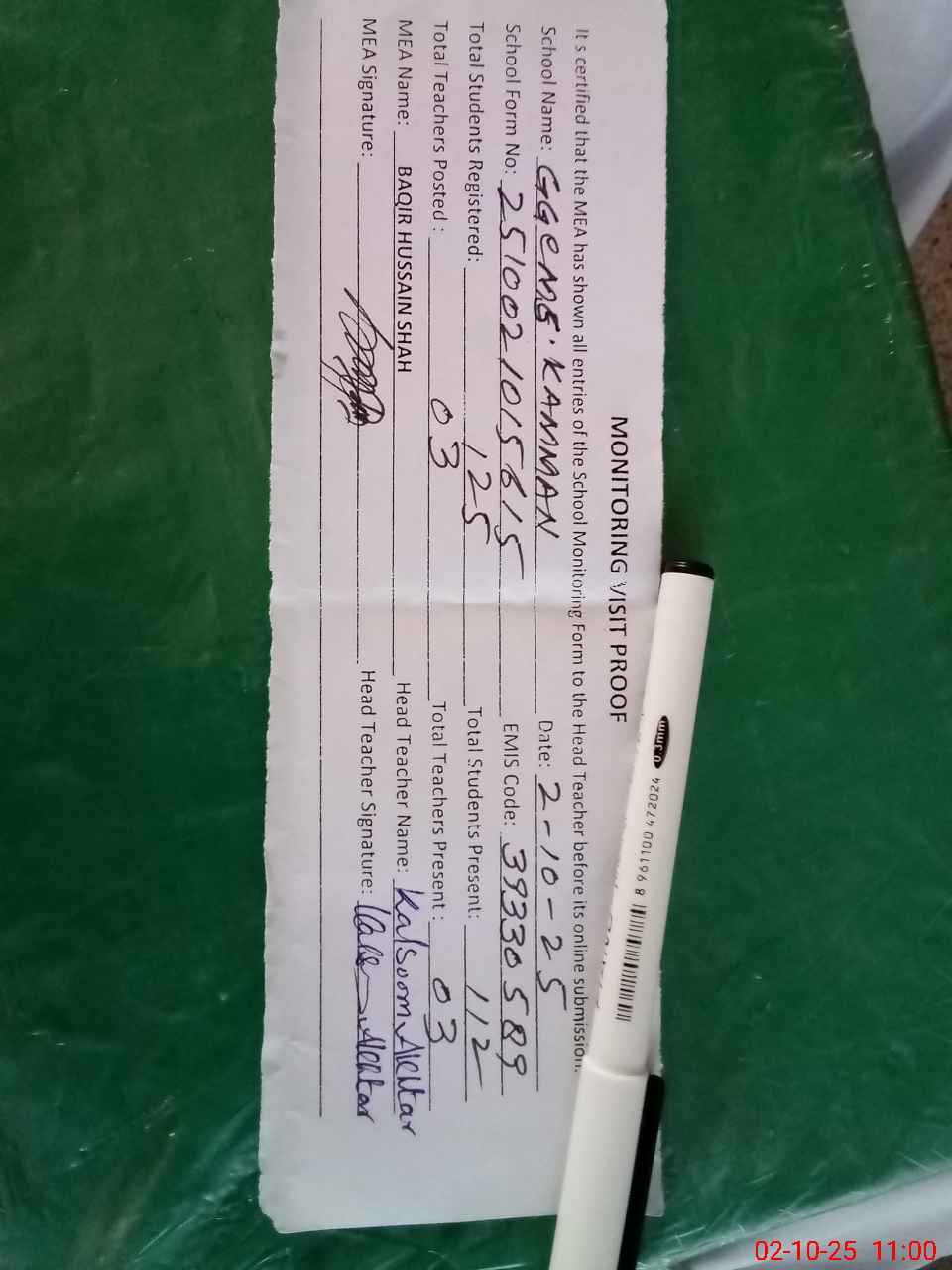 | Attendance Register | Head Teacher | MEA with School | Visit Proof |