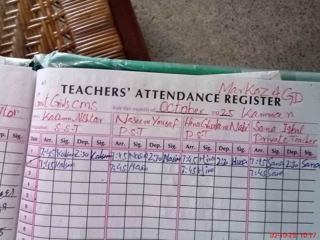 | CNIC | Full Name | Designation | R/C | Absence During Last Calender Month |