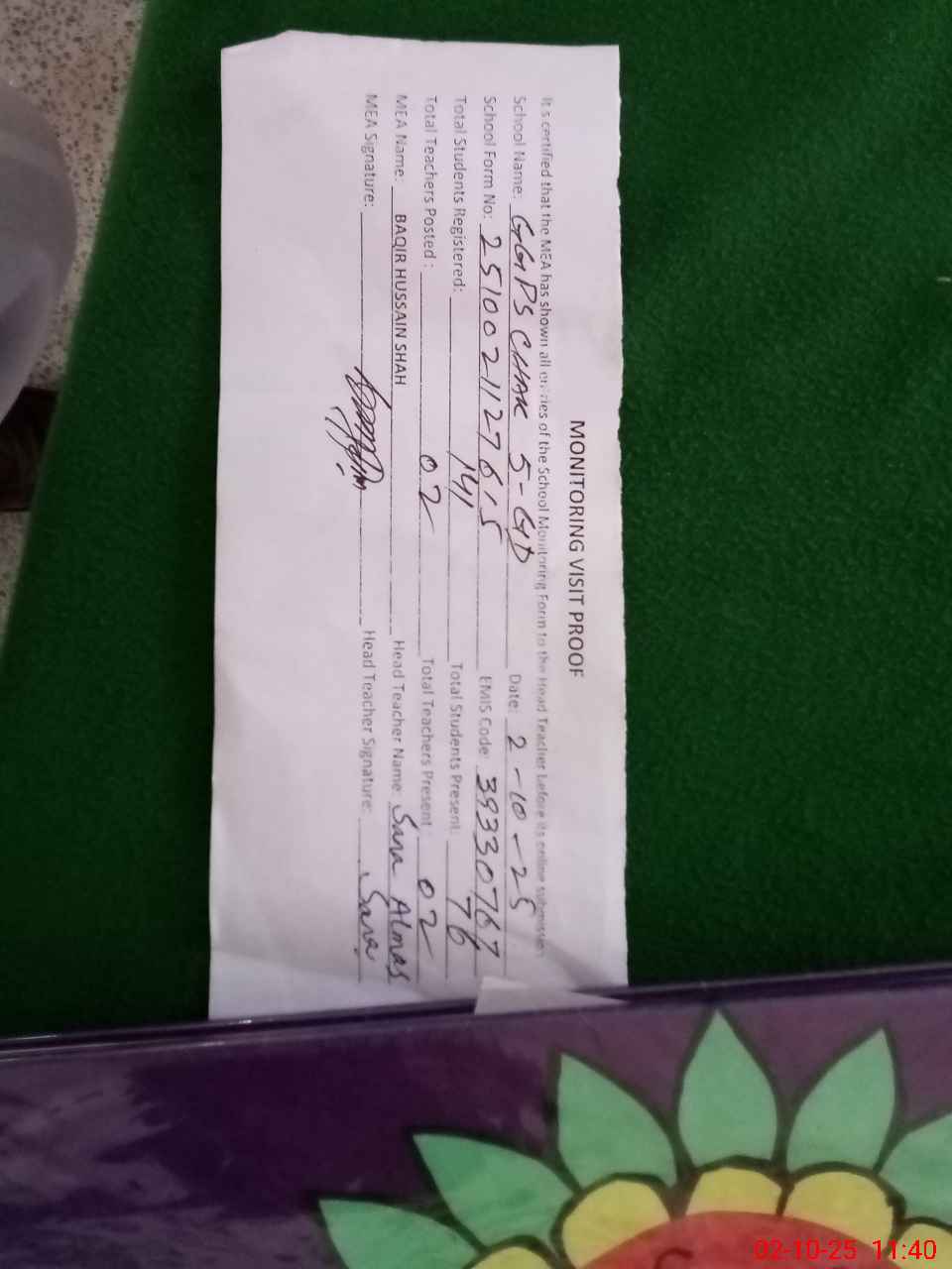| Attendance Register | Head Teacher | MEA with School | Visit Proof |