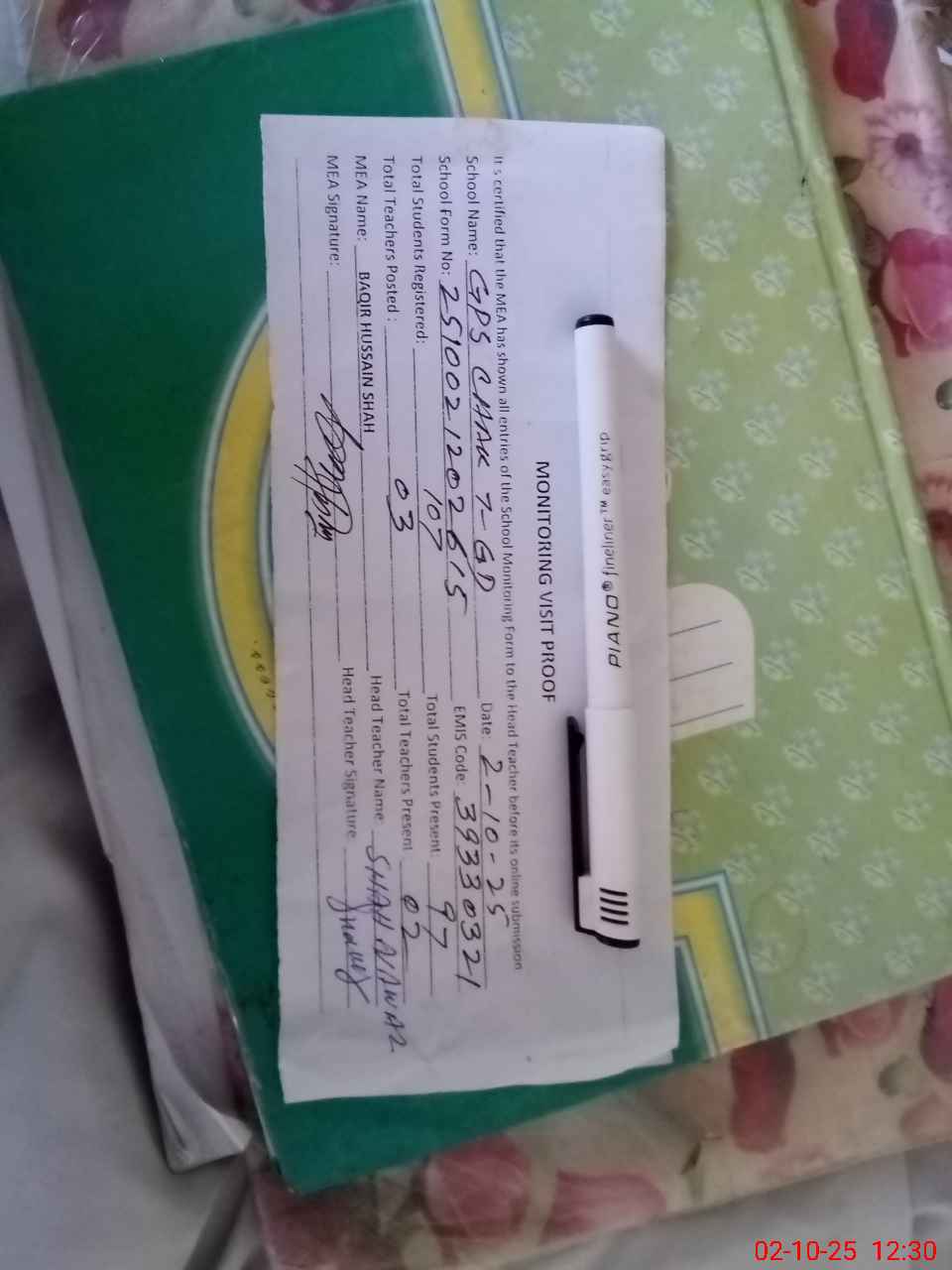 | Attendance Register | Head Teacher | MEA with School | Visit Proof |