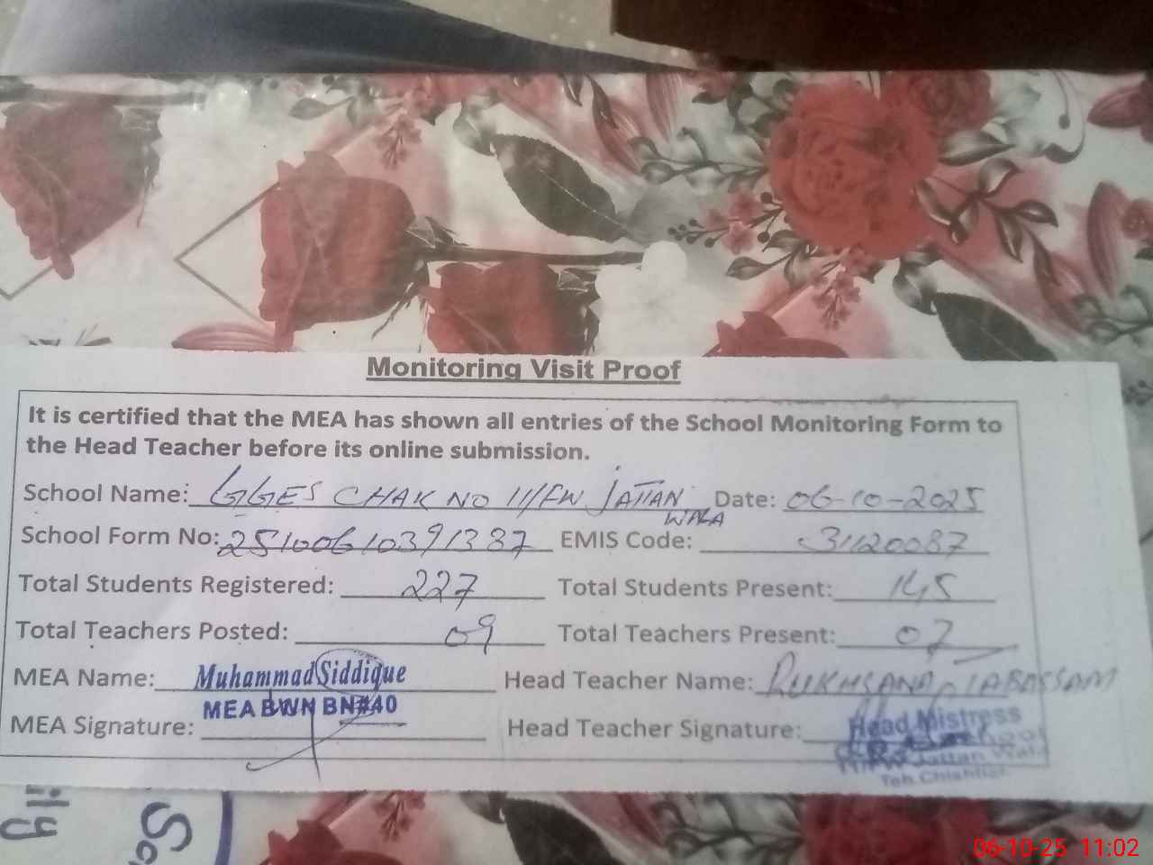 | Certified that this School was Inspected by the Undersigned MEA/DMO Today and the Information Stated Above is as Per Record. | |||||