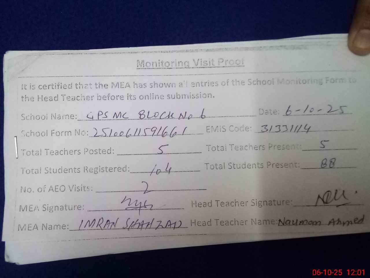 | EMIS Code: 31331114 | Name of School: GPS MC BLOCK NO. 6 RYK | |||