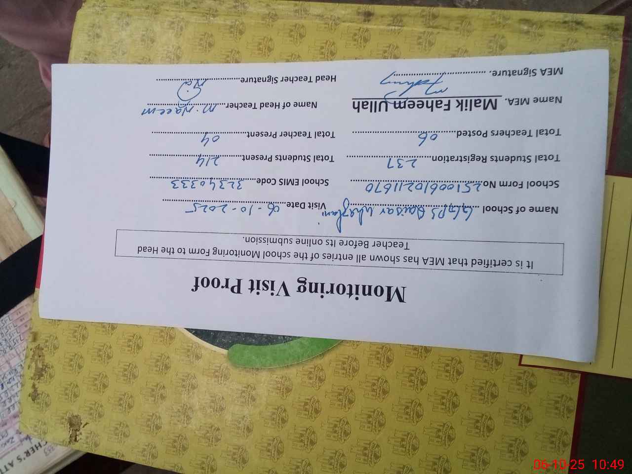 | Certified that this School was Inspected by the Undersigned MEA/DMO Today and the Information Stated Above is as Per Record. | |||||
