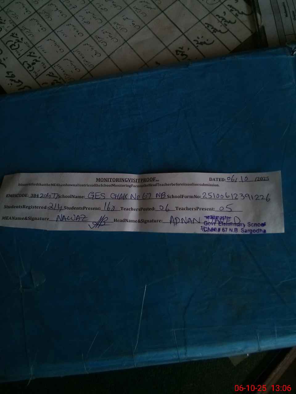 | Certified that this School was Inspected by the Undersigned MEA/DMO Today and the Information Stated Above is as Per Record. | |||||