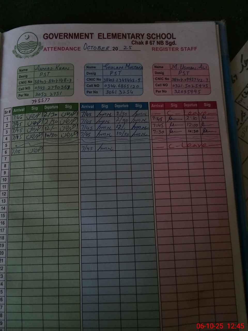 | CNIC | Full Name | Designation | R/C | Absence during last cal. month |