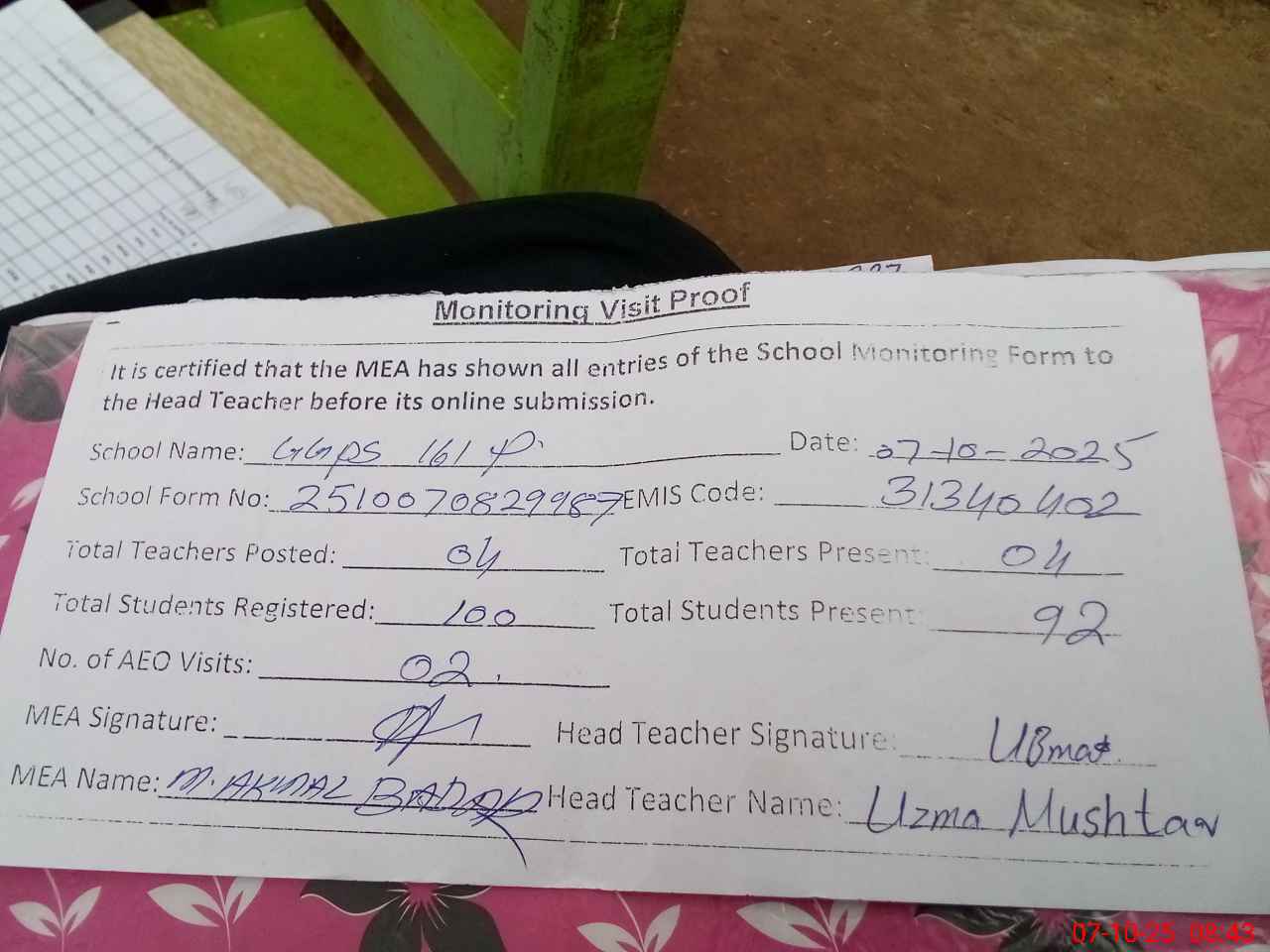 | Attendance Register | Head Teacher | MEA with School | Visit Proof |