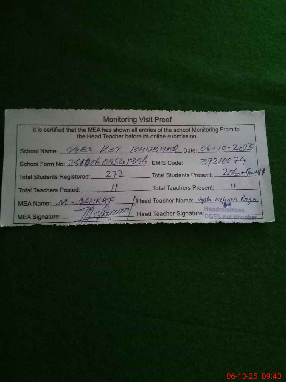 | Monitoring Date: 06-10-2025 | Start Time: 06-10-2025 08:54 AM | End Time: 06-10-2025 09:40 AM | Name of MEA: MU**** AS**** | |