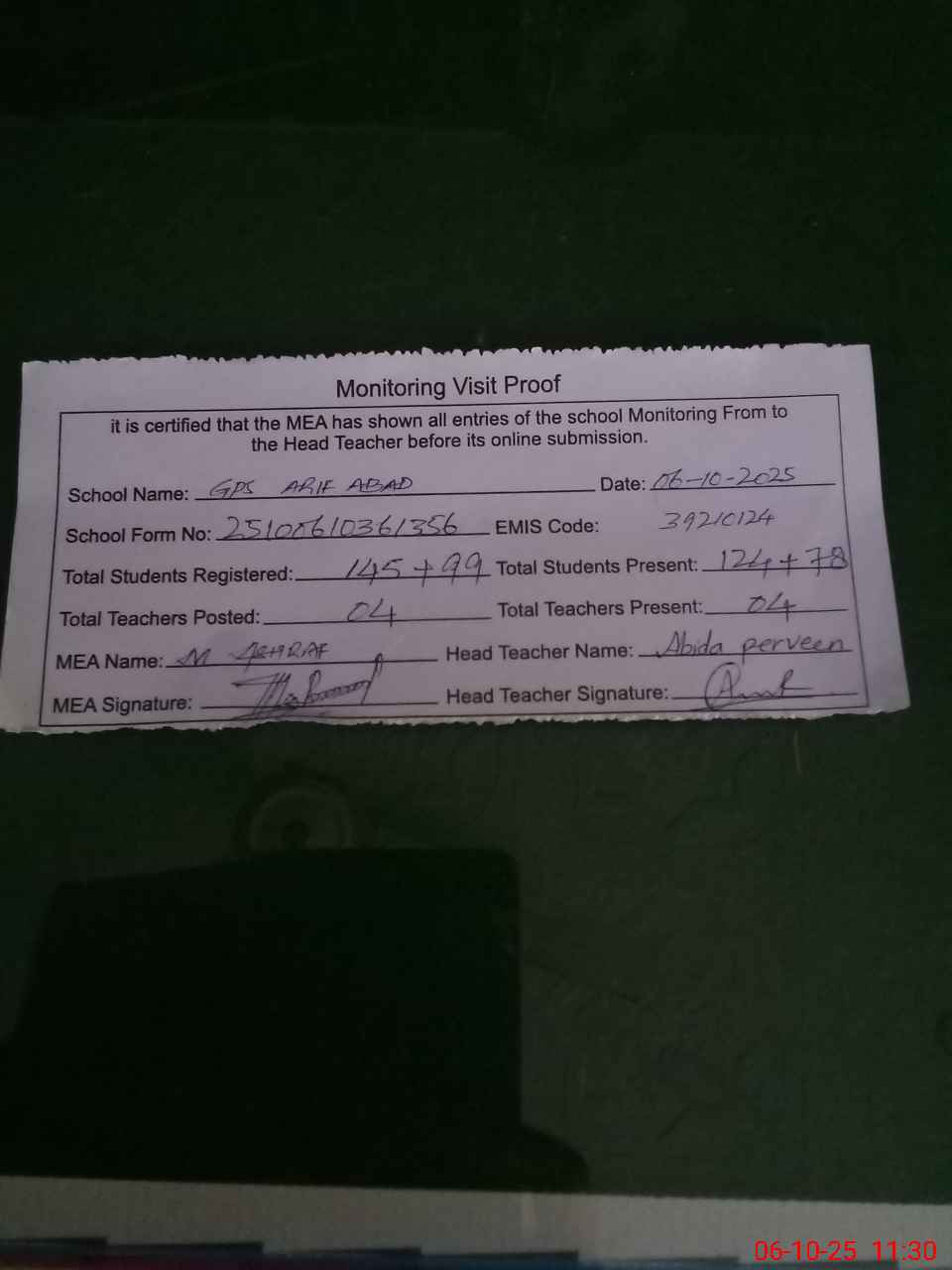| Monitoring Date: 06-10-2025 | Start Time: 06-10-2025 10:36 AM | End Time: 06-10-2025 11:30 AM | Name of MEA: MU**** AS**** | |