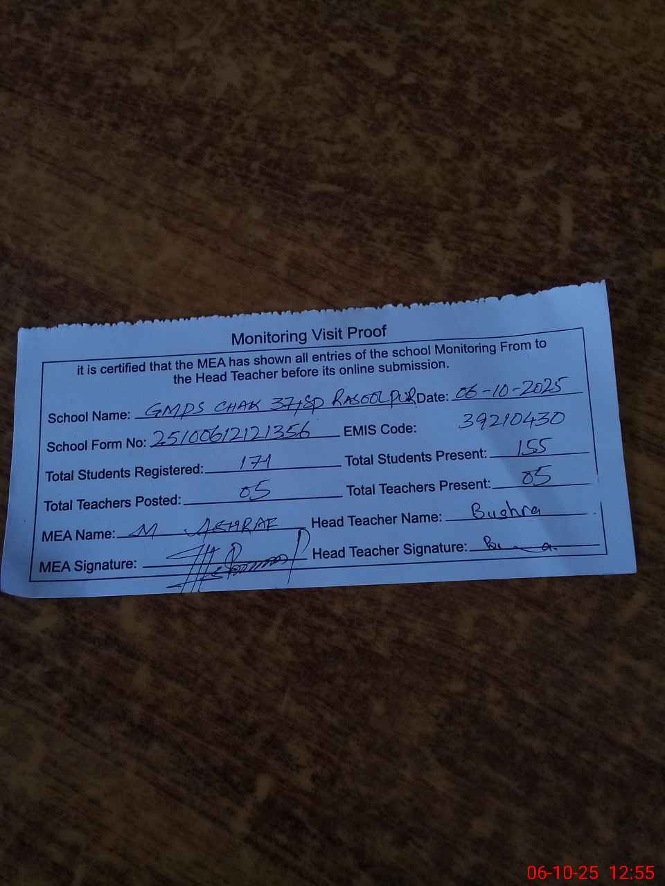 | EMIS Code: 39210430 | Name of School: GMPS CHAK 37/SP RASOOL PUR | |||