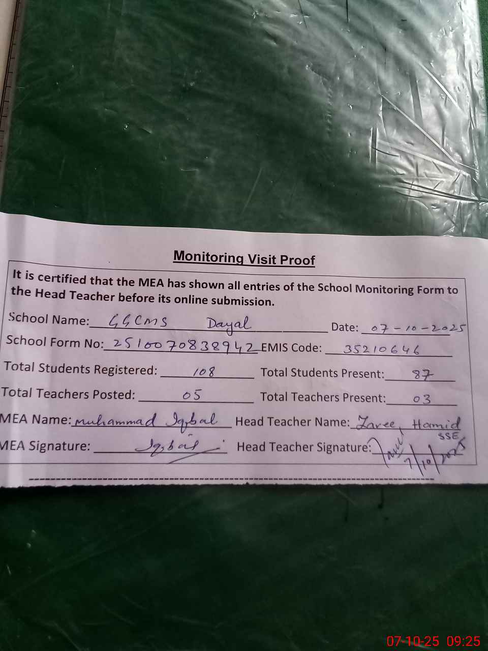 | Monitoring Date: 07-10-2025 | Start Time: 07-10-2025 08:38 AM | End Time: 07-10-2025 09:32 AM | Name of MEA: Mu**** Iq**** | |