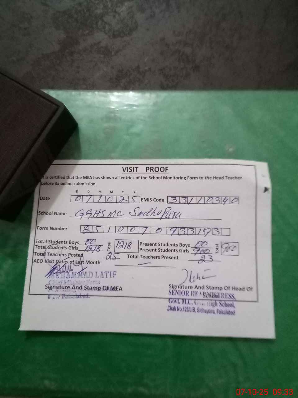 | EMIS Code: 33110340 | Name of School: GGHS MC SIDHO PURA FAISALABAD | |||