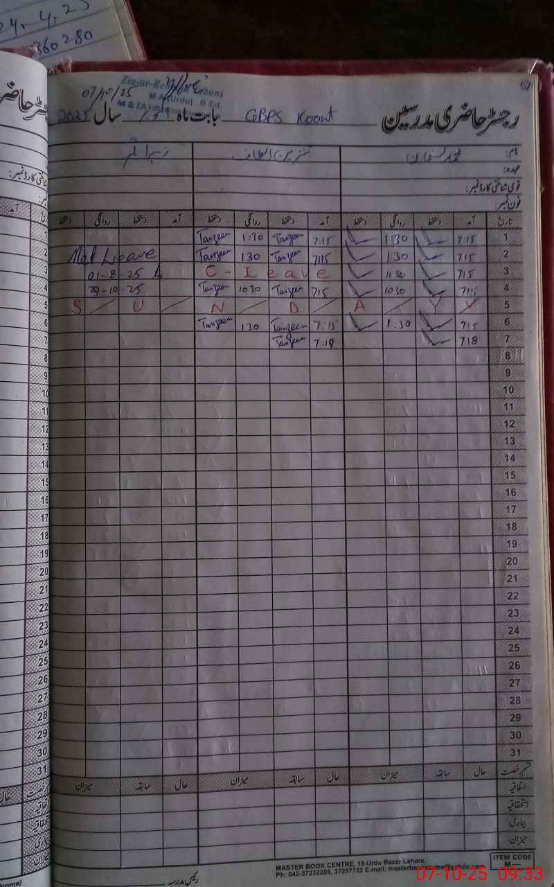 | CNIC | Full Name | Designation | R/C | Absence During Last Calender Month |