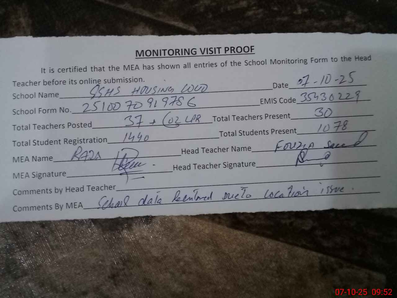 | Certified that this School was Inspected by the Undersigned MEA/DMO Today and the Information Stated Above is as Per Record. | |||||