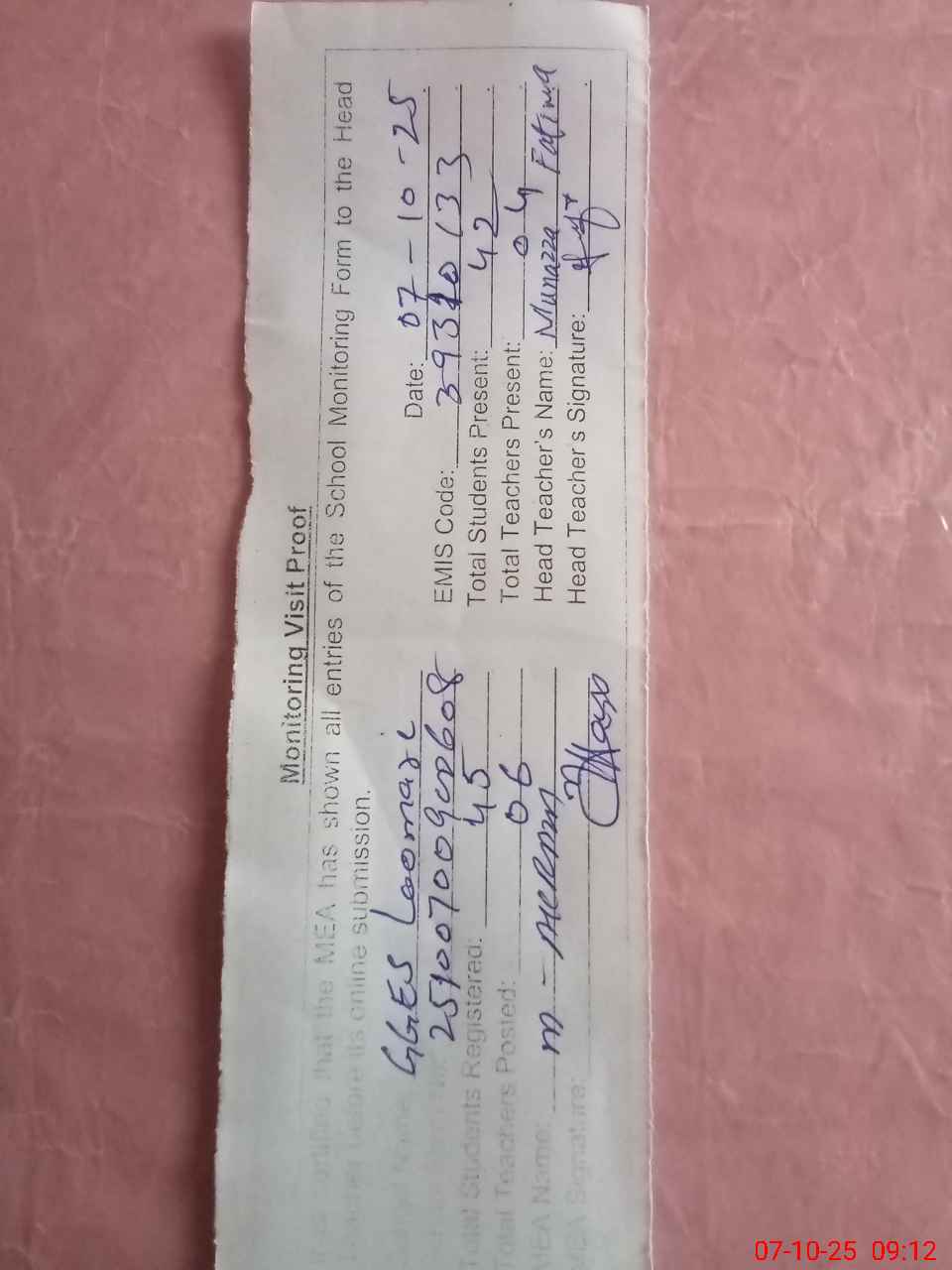 | Attendance Register | Head Teacher | MEA with School | Visit Proof |