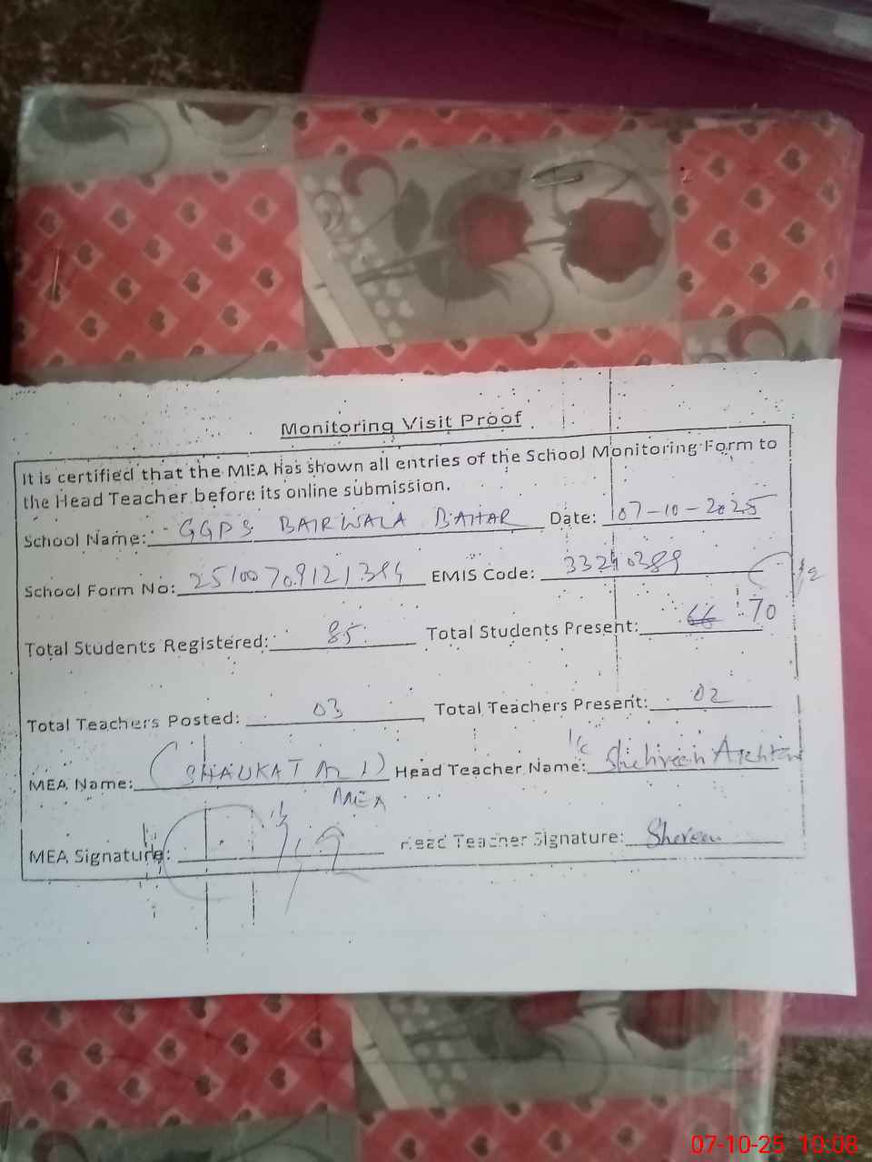 | Attendance Register | Head Teacher | MEA with School | Visit Proof |