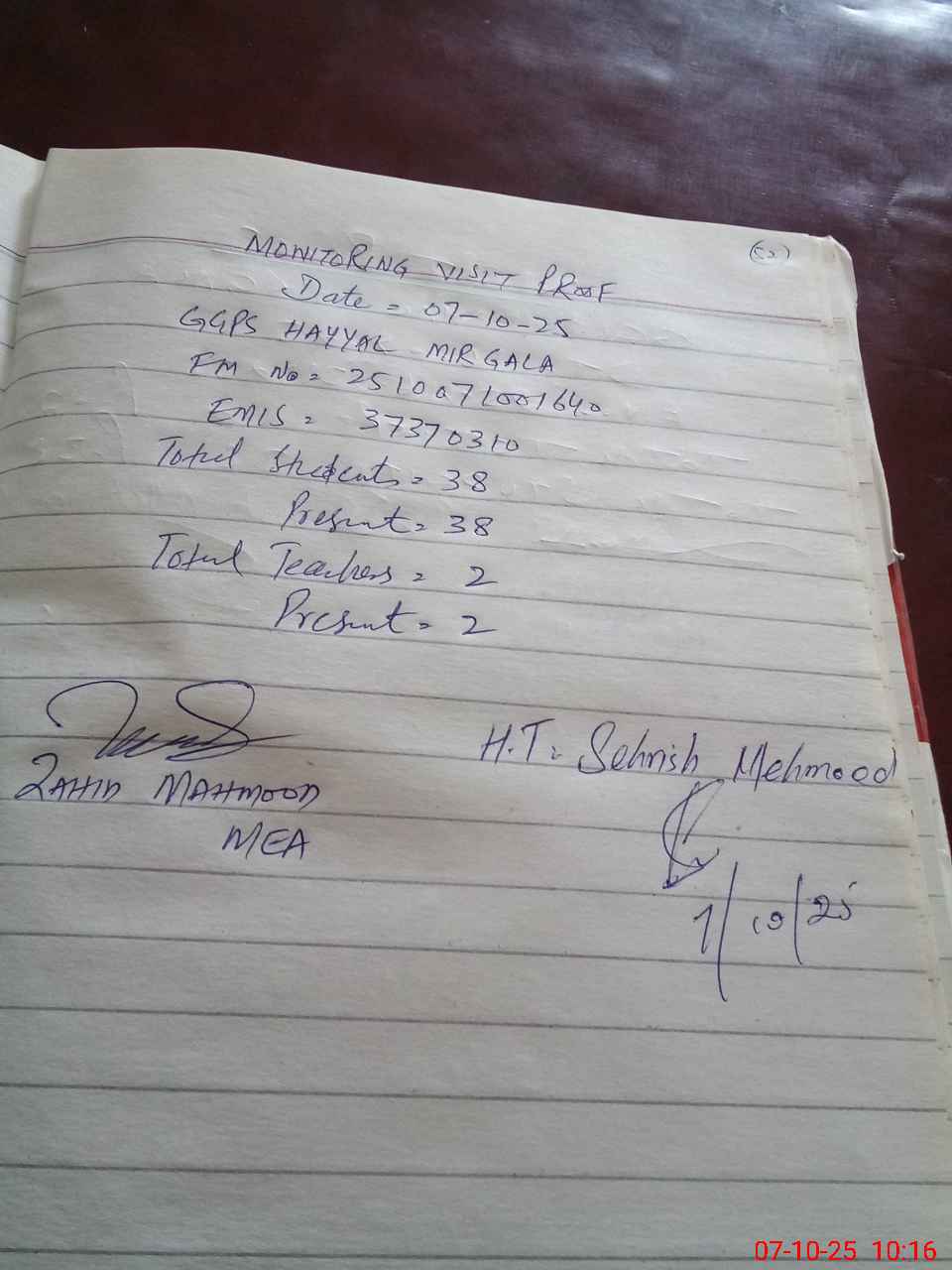 | Monitoring Date: 07-10-2025 | Start Time: 07-10-2025 09:58 AM | End Time: 07-10-2025 10:23 AM | Name of MEA: Za**** Me**** | |