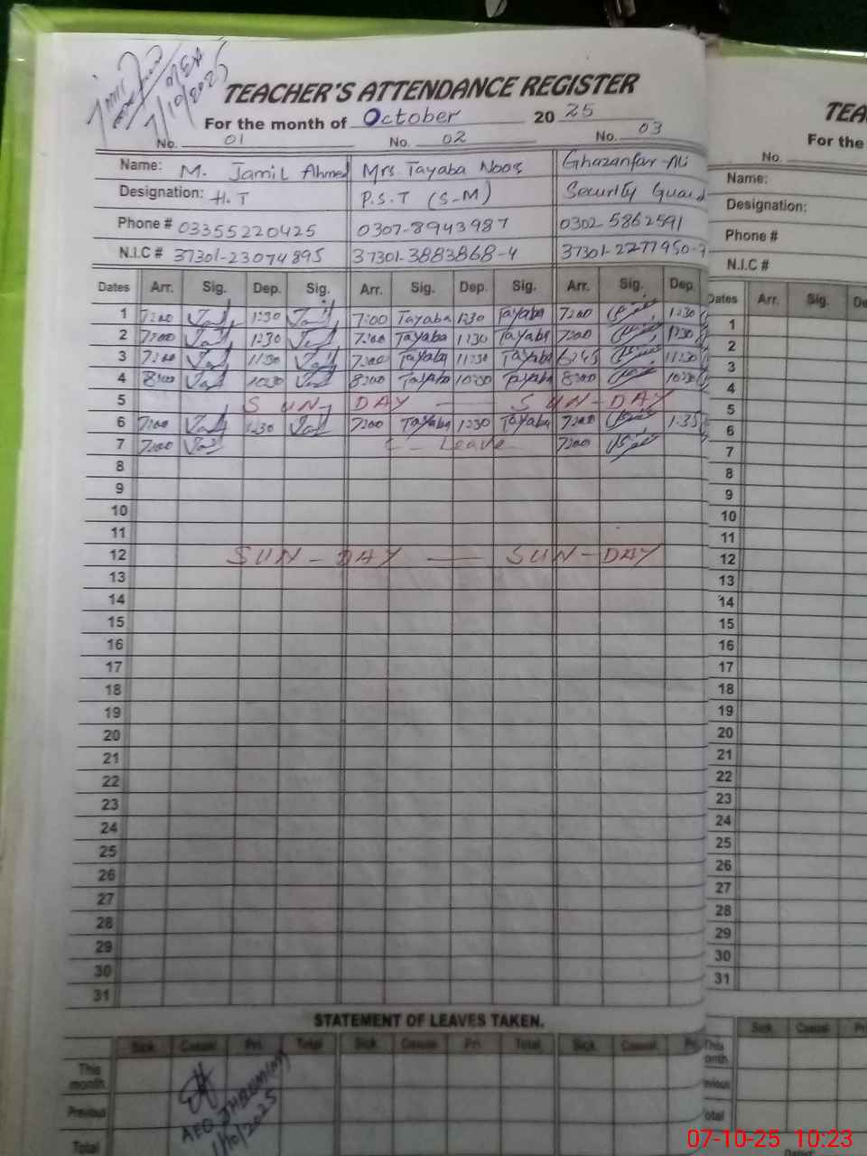| CNIC | Full Name | Designation | R/C | Absence During Last Calender Month |
