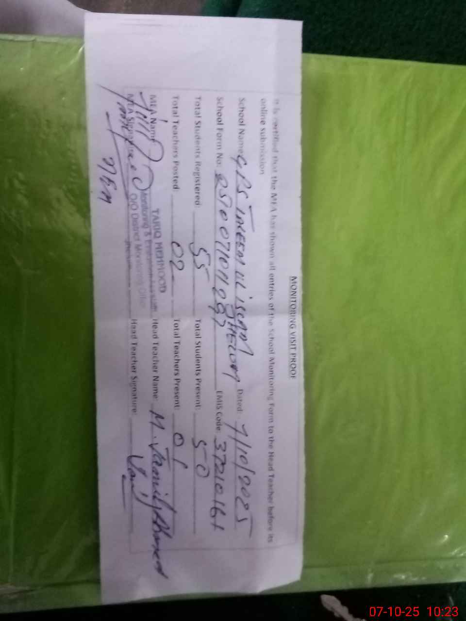 | Attendance Register | Head Teacher | MEA with School | Visit Proof |