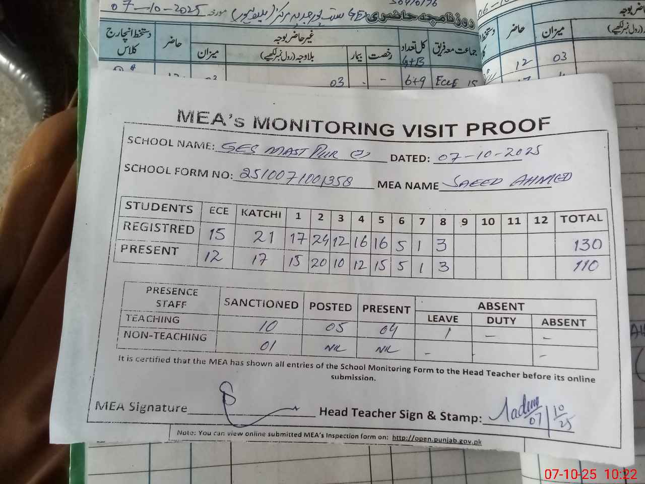 | Monitoring Date: 07-10-2025 | Start Time: 07-10-2025 09:06 AM | End Time: 07-10-2025 10:25 AM | Name of MEA: Sa**** Ah**** | |