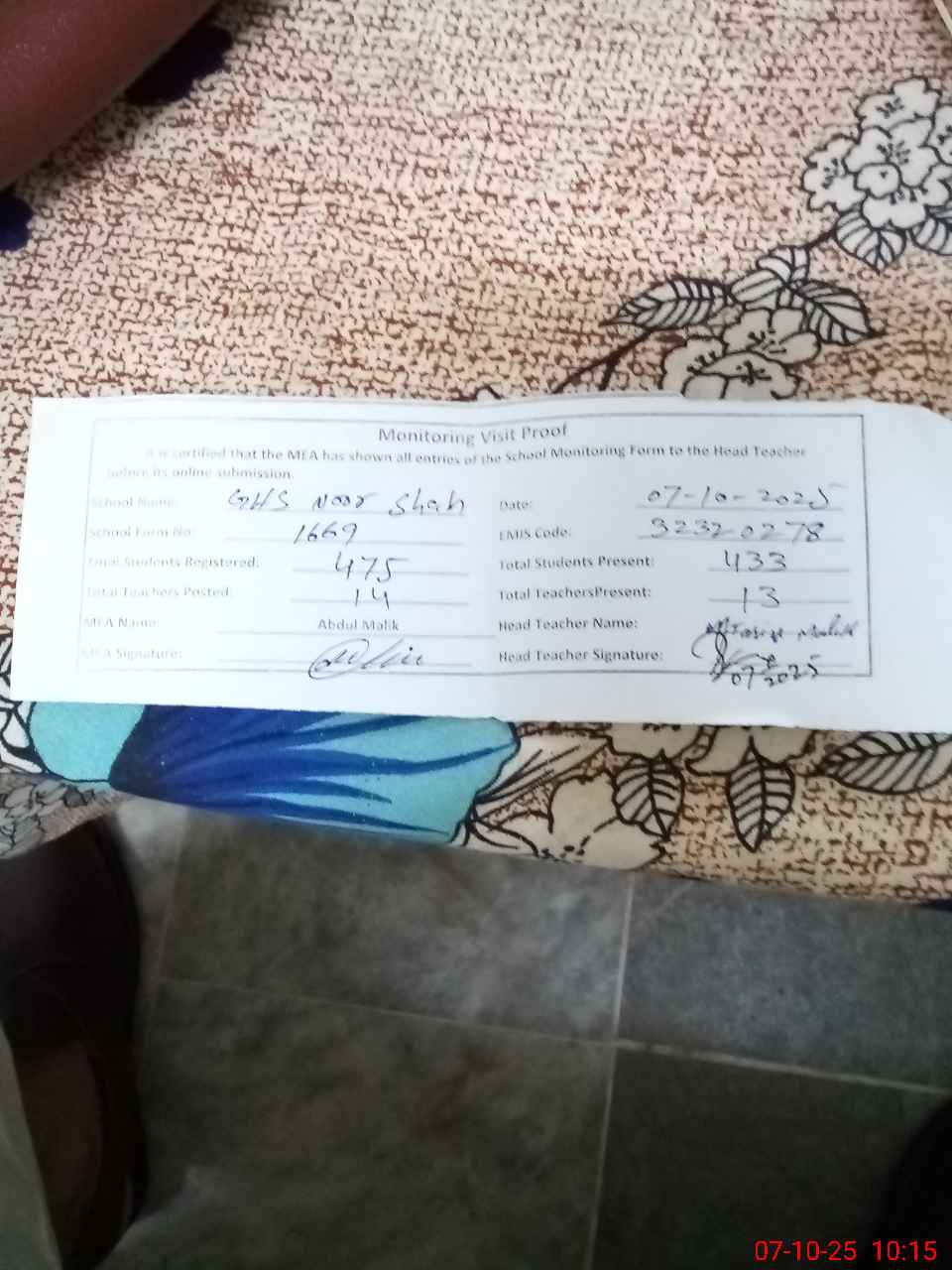 | EMIS Code: 32320278 | Name of School: GHS NOOR SHAH | |||