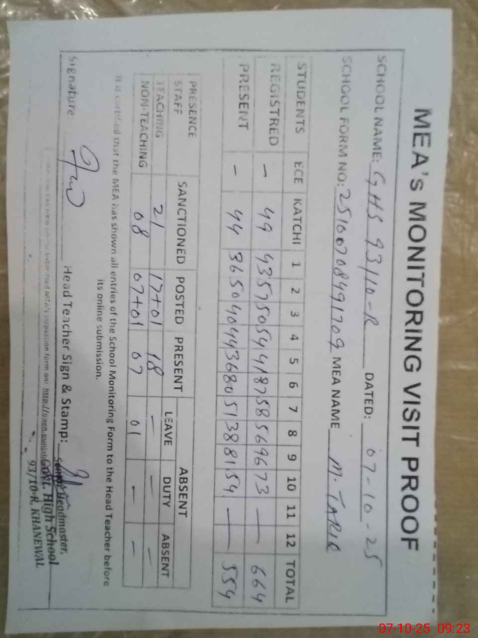 | Attendance Register | Head Teacher | MEA with School | Visit Proof |