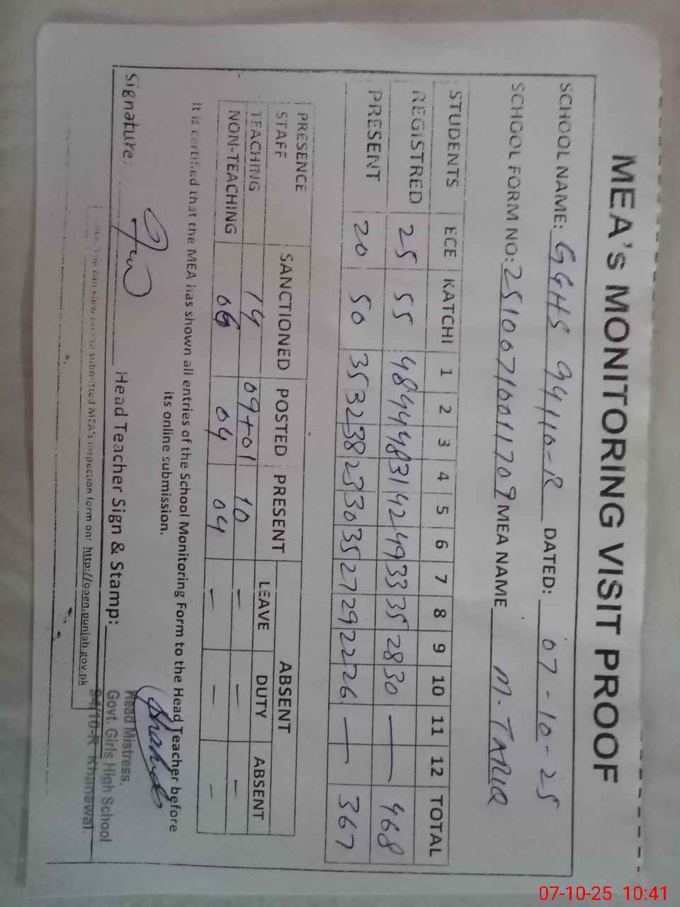 | Attendance Register | Head Teacher | MEA with School | Visit Proof |
