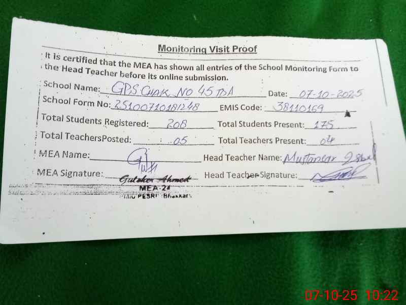 | EMIS Code: 38110169 | Name of School: GPS CHAK NO 45 TDA | |||