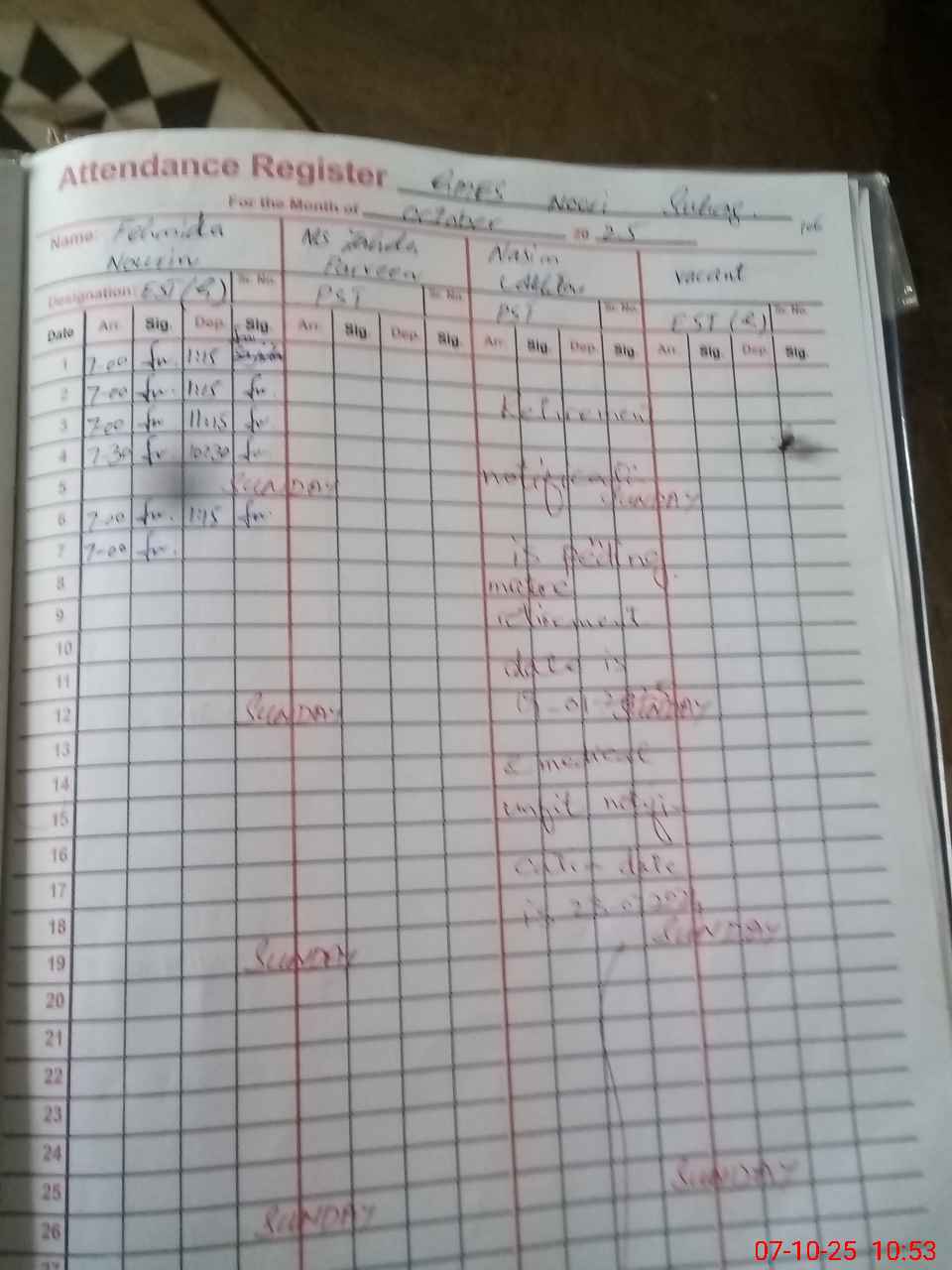 | 36**** | Za**** Pa**** | 1 | 0 | 0 | 20 | 0 | 0 | 0 | 0 | 0 | 0 | Absent (Un-Authorized) | |