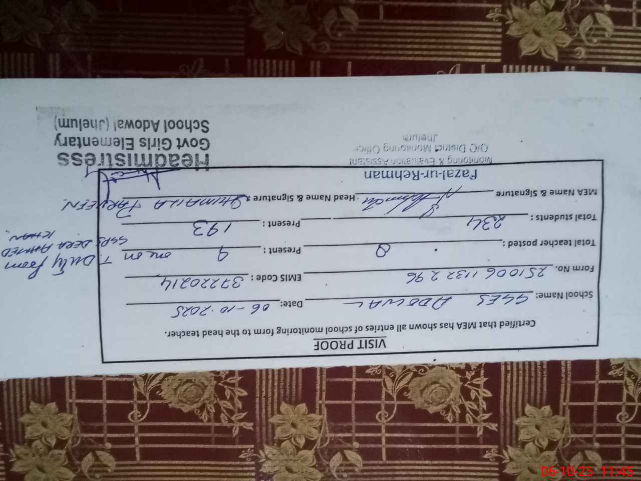 | Certified that this School was Inspected by the Undersigned MEA/DMO Today and the Information Stated Above is as Per Record. | |||||