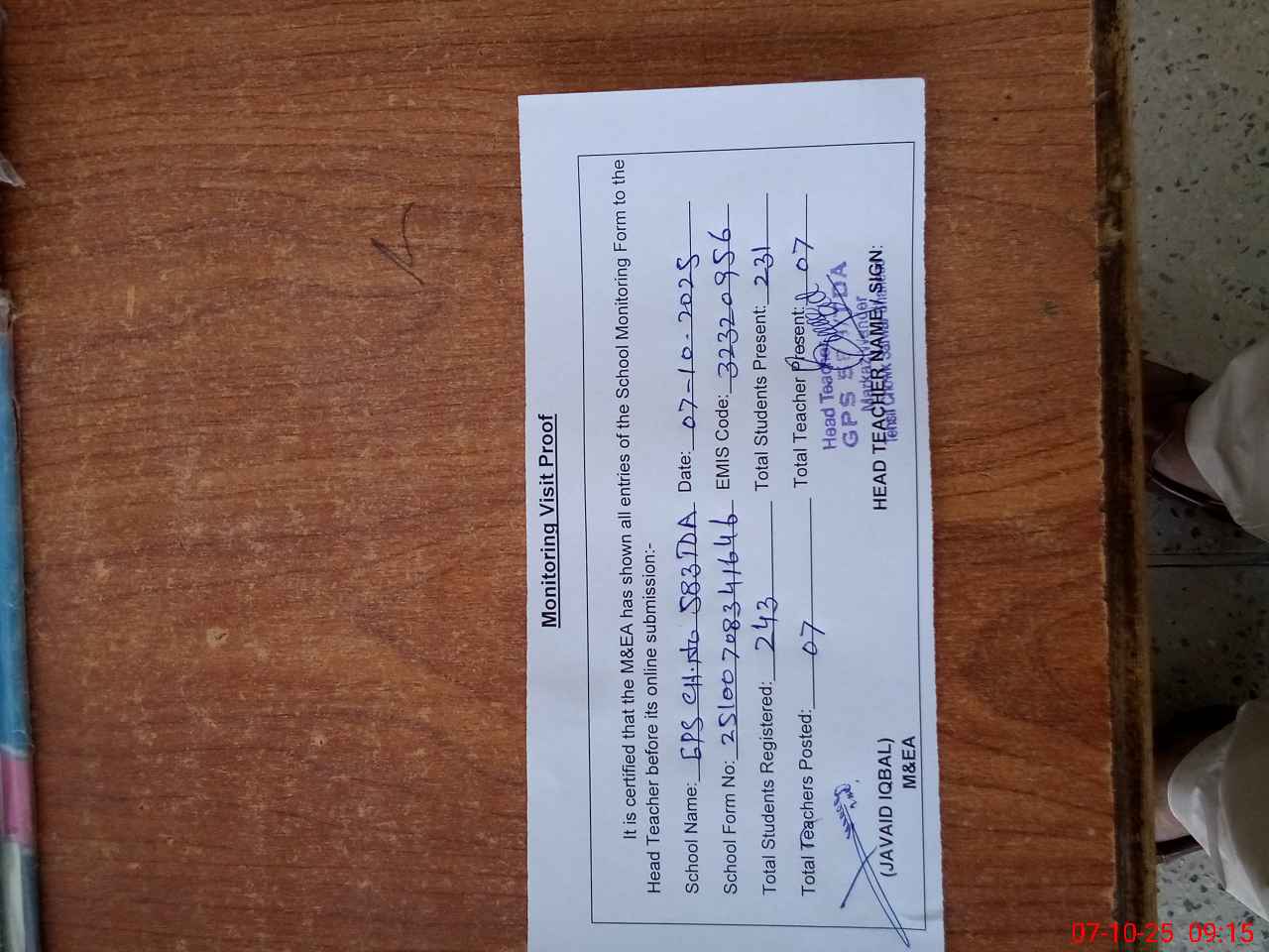 | EMIS Code: 32320956 | Name of School: GPS CHAK NO. 583 TDA | |||