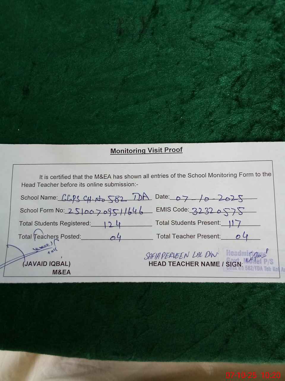 | EMIS Code: 32320575 | Name of School: GGPS CHAK NO. 582/TDA | |||