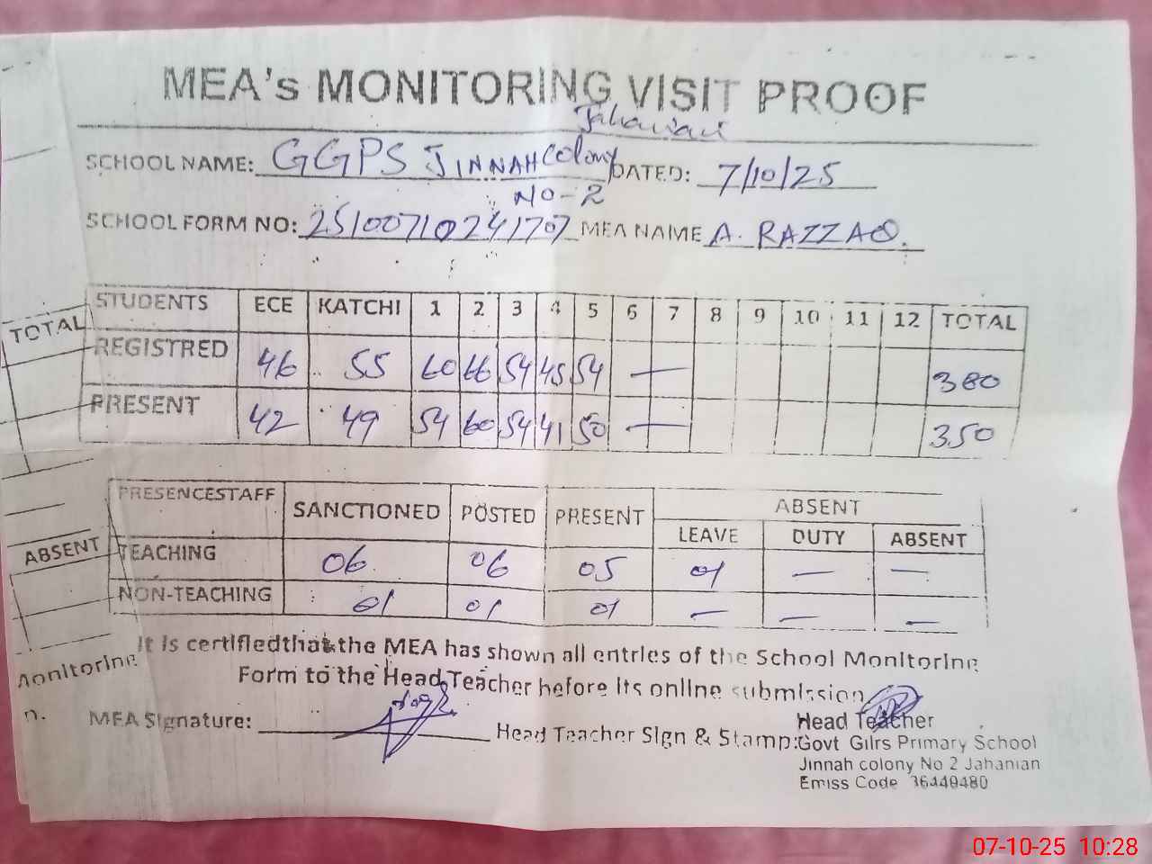 | EMIS Code: 36440480 | Name of School: GGPS JINNAH COLONY NO.2 JAHANIAN | |||