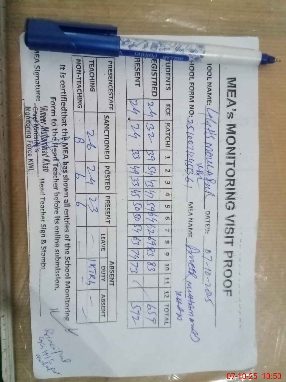 | Attendance Register | Head Teacher | MEA with School | Visit Proof |