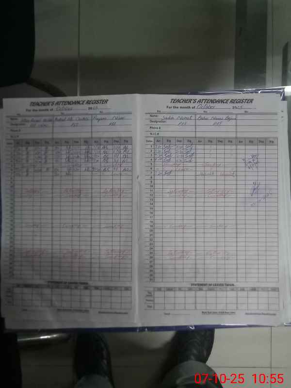 | Remarks (Use Separate Page if Required): Attendance of teaching staff on SIS Software is not updated Students attendance on SIS Software is updated Babar Nawaz Bajwa PST absent from his duty he applied Study Leave w e f 01 September 2025 but yet not approved Data as per provided by School Staff and found during physical visit | |||||