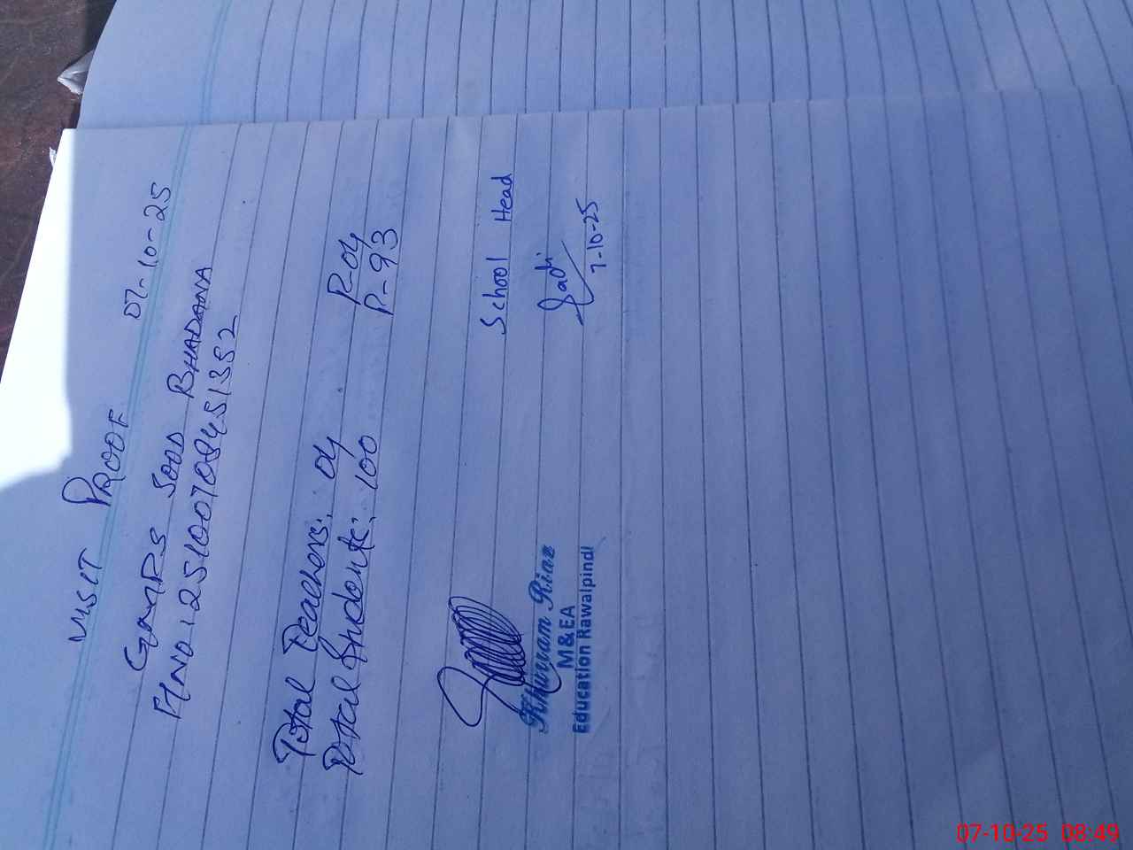 | Attendance Register | Head Teacher | MEA with School | Visit Proof |