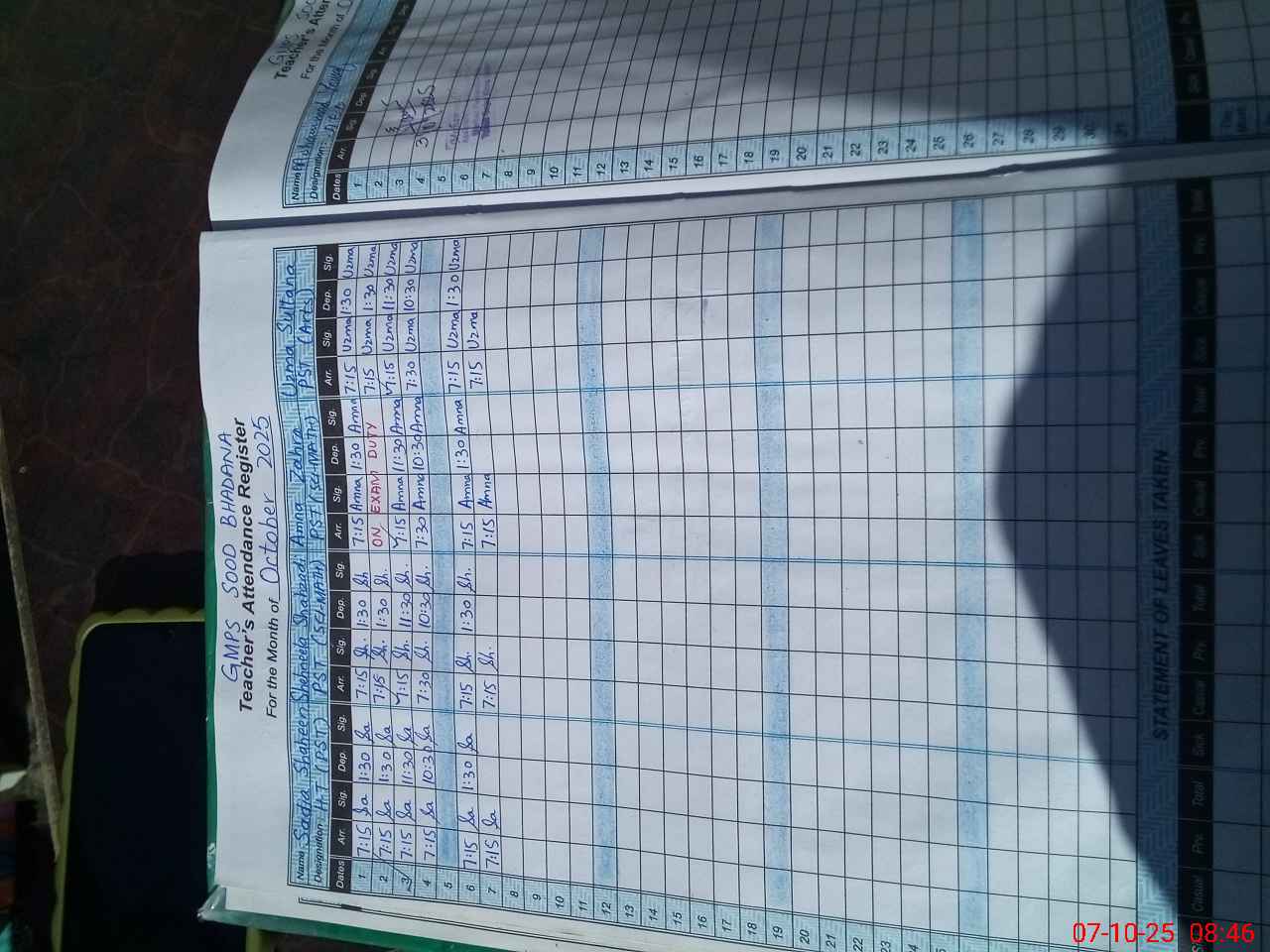 Leave Type | Remarks for today (Leave,Training, Exam,Absent,Late, Other duty) |