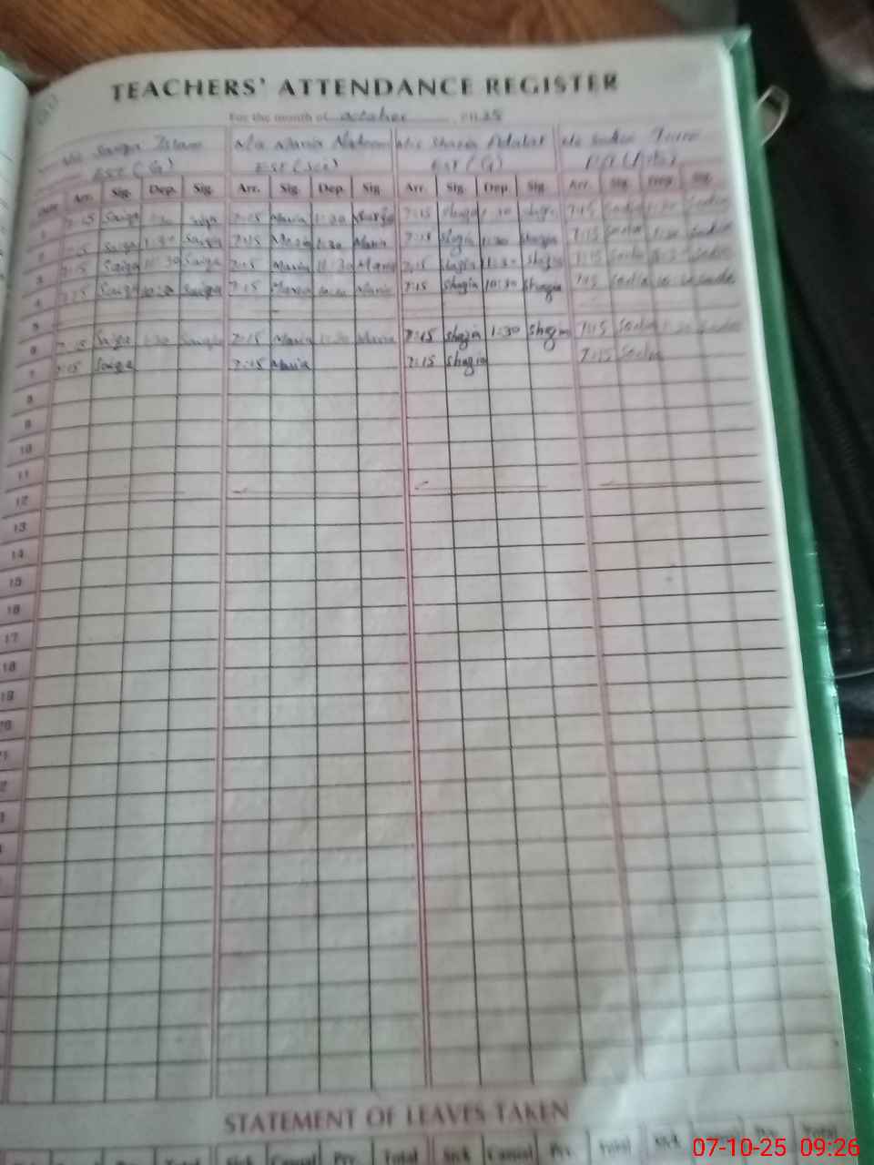 Leave Type | Remarks for today (Leave,Training, Exam,Absent,Late, Other duty) |