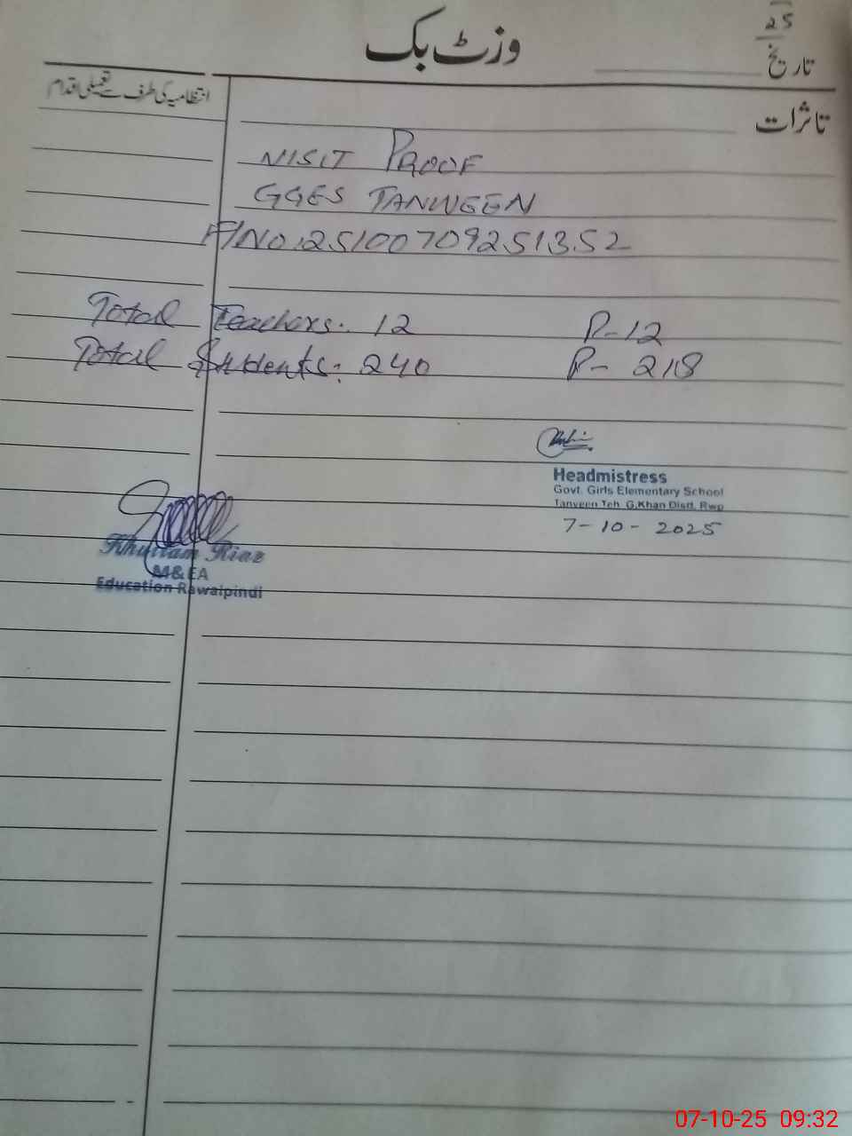 | Certified that this School was Inspected by the Undersigned MEA/DMO Today and the Information Stated Above is as Per Record. | |||||
