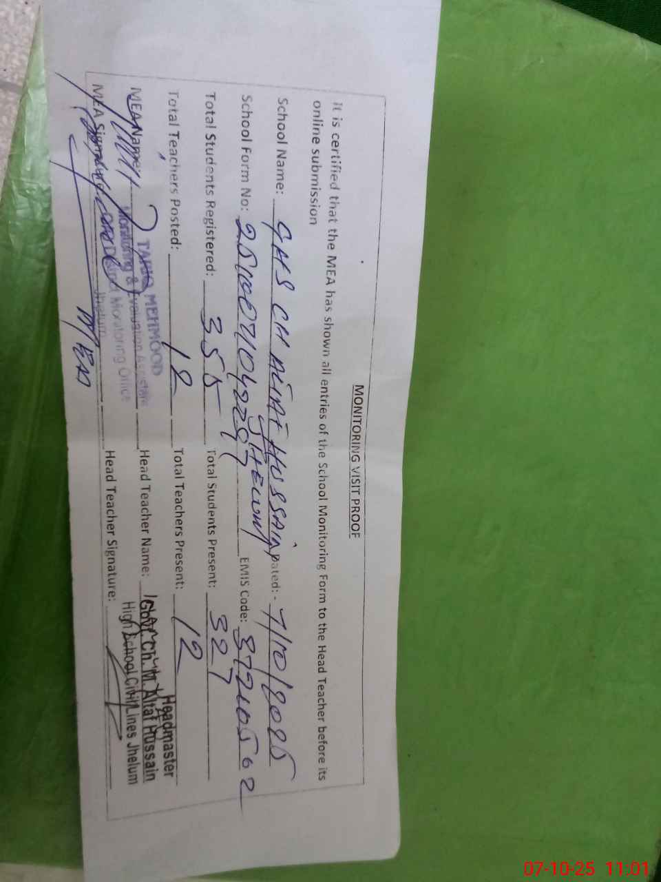 | EMIS Code: 37210502 | Name of School: GHS CH. MUHAMMAD ALTAF HUSSAIN CIVIL LINES JHELUM | |||