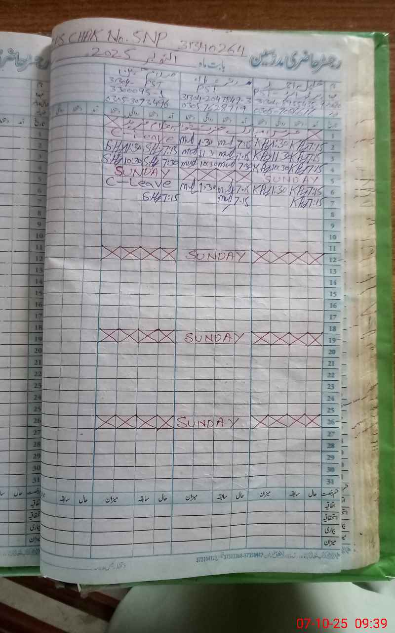 | CNIC | Full Name | Designation | R/C | Absence During Last Calender Month |